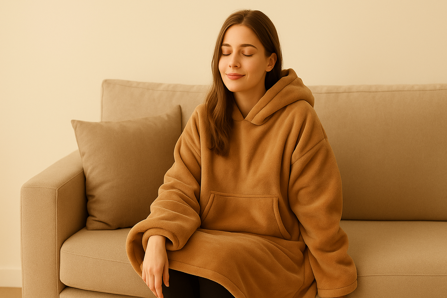 CosyHug™ est taille unique et surdimensionné, conçu pour convenir à toutes les morphologies — homme ou femme, petit ou grand.